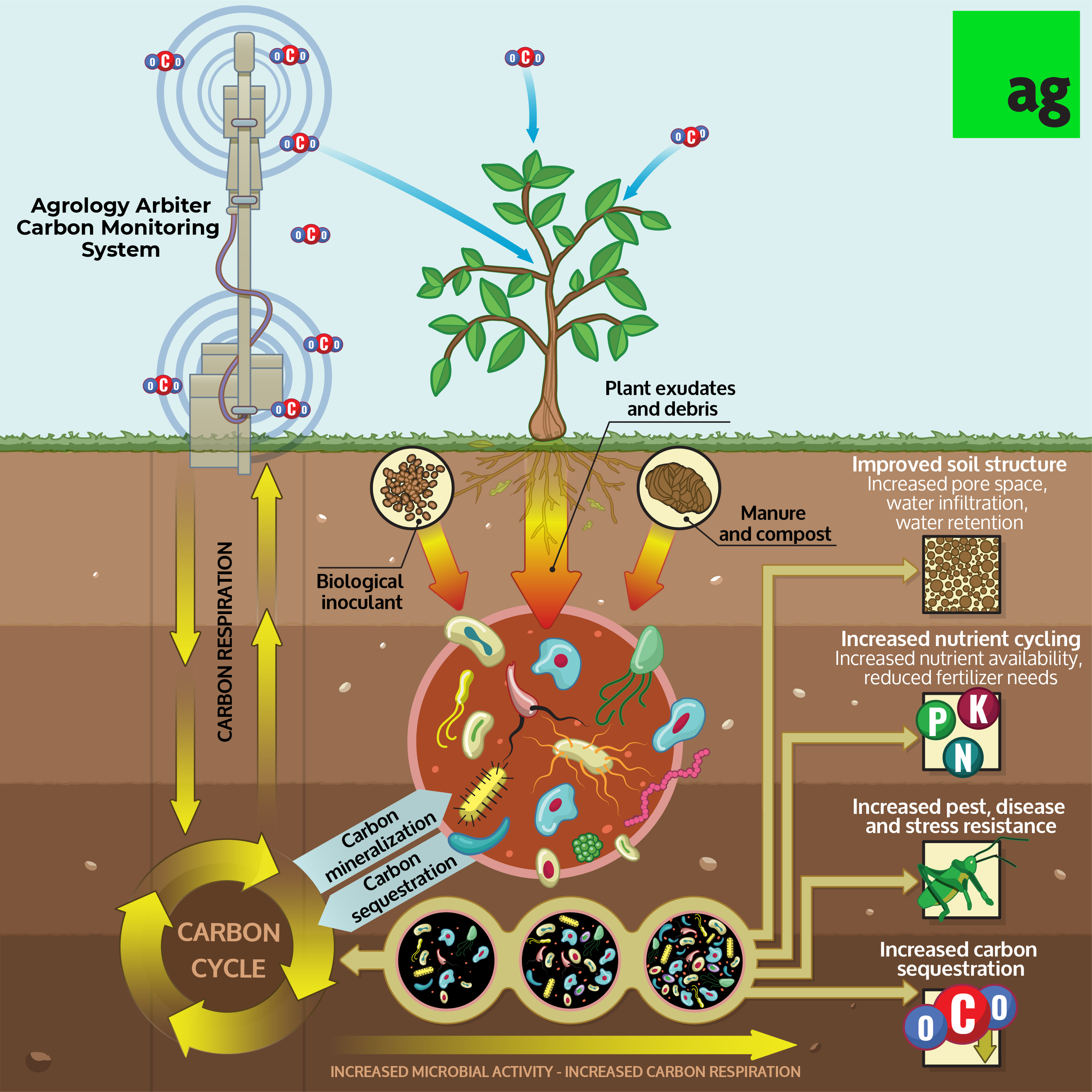 Track your most valuable asset in real time. Agrology’s in-field sensors deliver accurate, ground-truth data on soil health, respiration, and greenhouse gas emissions. Across crops, climates, and soil types. Monitor changes in microbial activity and carbon cycling to quantify the impact of regenerative practices and protect long-term soil value. No more guesswork. Just actionable insights to improve performance and build resilience..